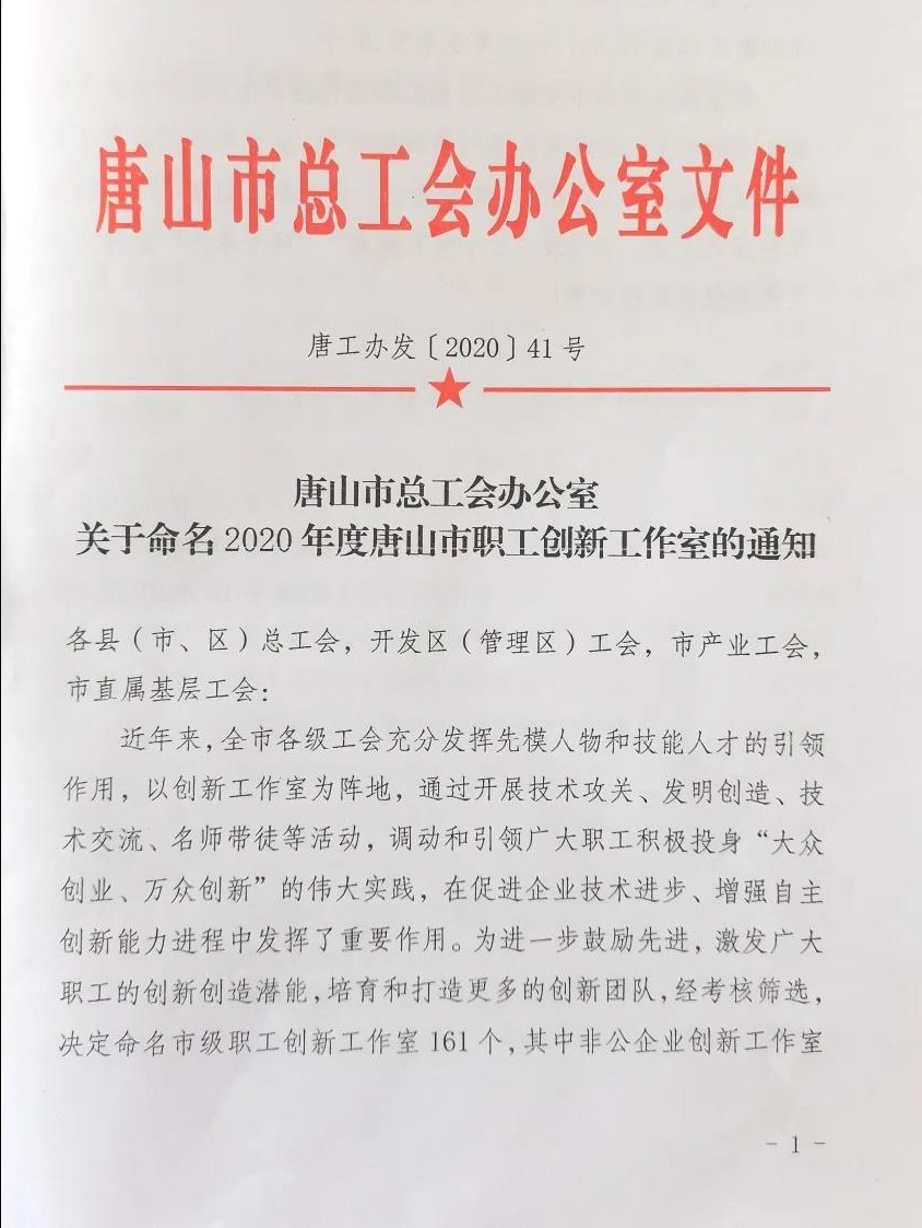 喜訊!公司劉子玉等5個創(chuàng)新工作室獲評“2020年度唐山市職工創(chuàng)新工作室”